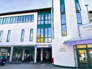 Die Parkplätze sind direkt am Gebäude, entlang der Schaufenster der Buchhandlung Kempter (ehemals Helming & Heuser). Wir sind im ersten Stock darüber.